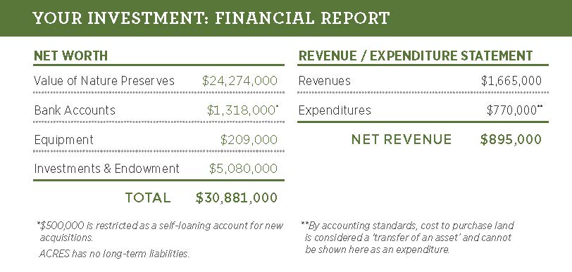 PEOPLE | 277 new members joined during this fiscal year. ACRES hosted 70+ hikes and events, engaging 1,000 people, inspiring them to protect the places they love. 800 new people followed us on Facebook, helping expand our reach to new audiences. 54 volunteers reported 900 hours of service, but we’re certain there’s more that goes unreported. We estimate that more than 150 volunteers provided 2,500 hours of service, a value of $61,725.