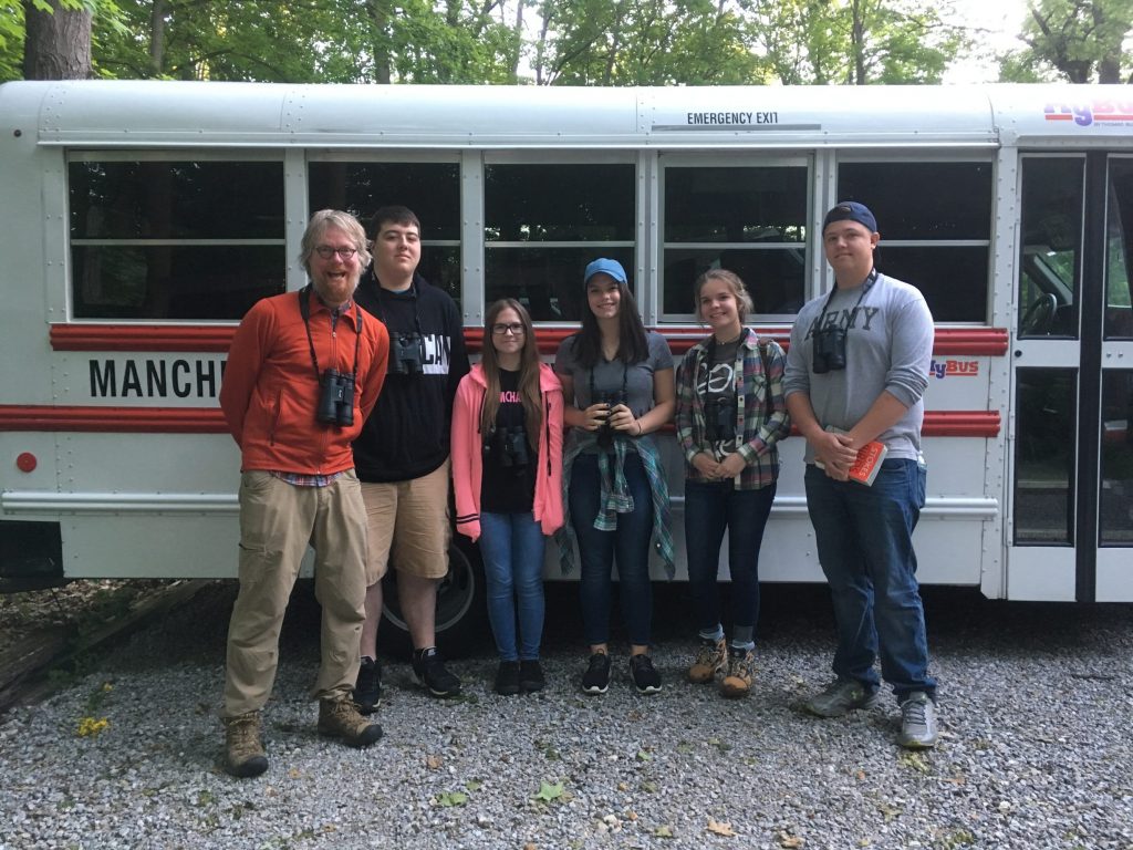 Jabin Burnworth, Manchester Junior-Senior High School biology teacher, left, and the MHS Bird Blitz team spotted birds at ACRES’ Wildwood preserve in Kosciusko County.