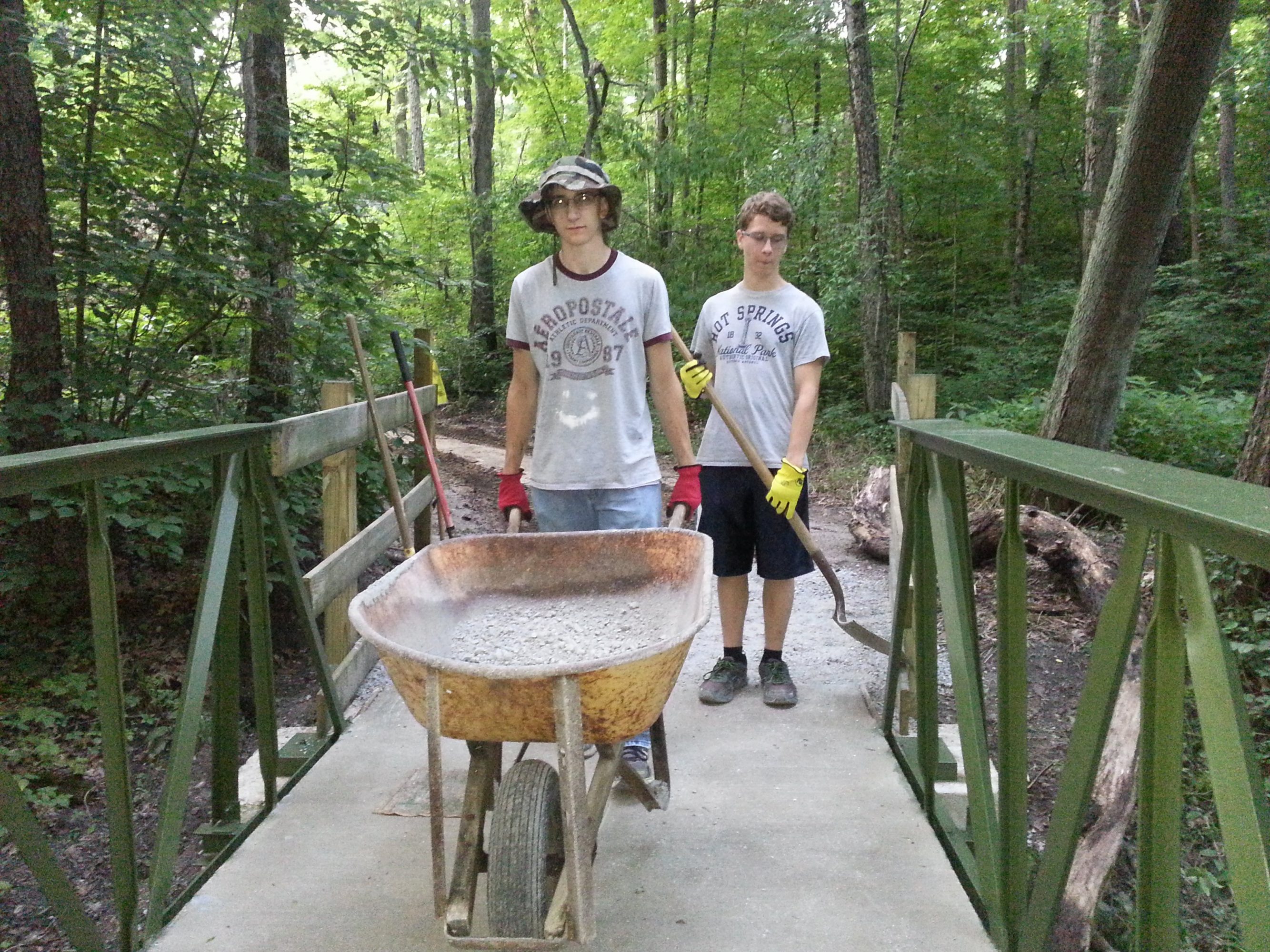 After several rainy days delayed the big installation work, Seiler’s vision began taking shape in the preserve. Heavy equipment carried in significant structural pieces for the new bridge and hauled out the sagging former bridge. With the bridge structure in place, a volunteer crew from Hagerman, 10 troop members and a handful of parents helped pour and finish the concrete decking.