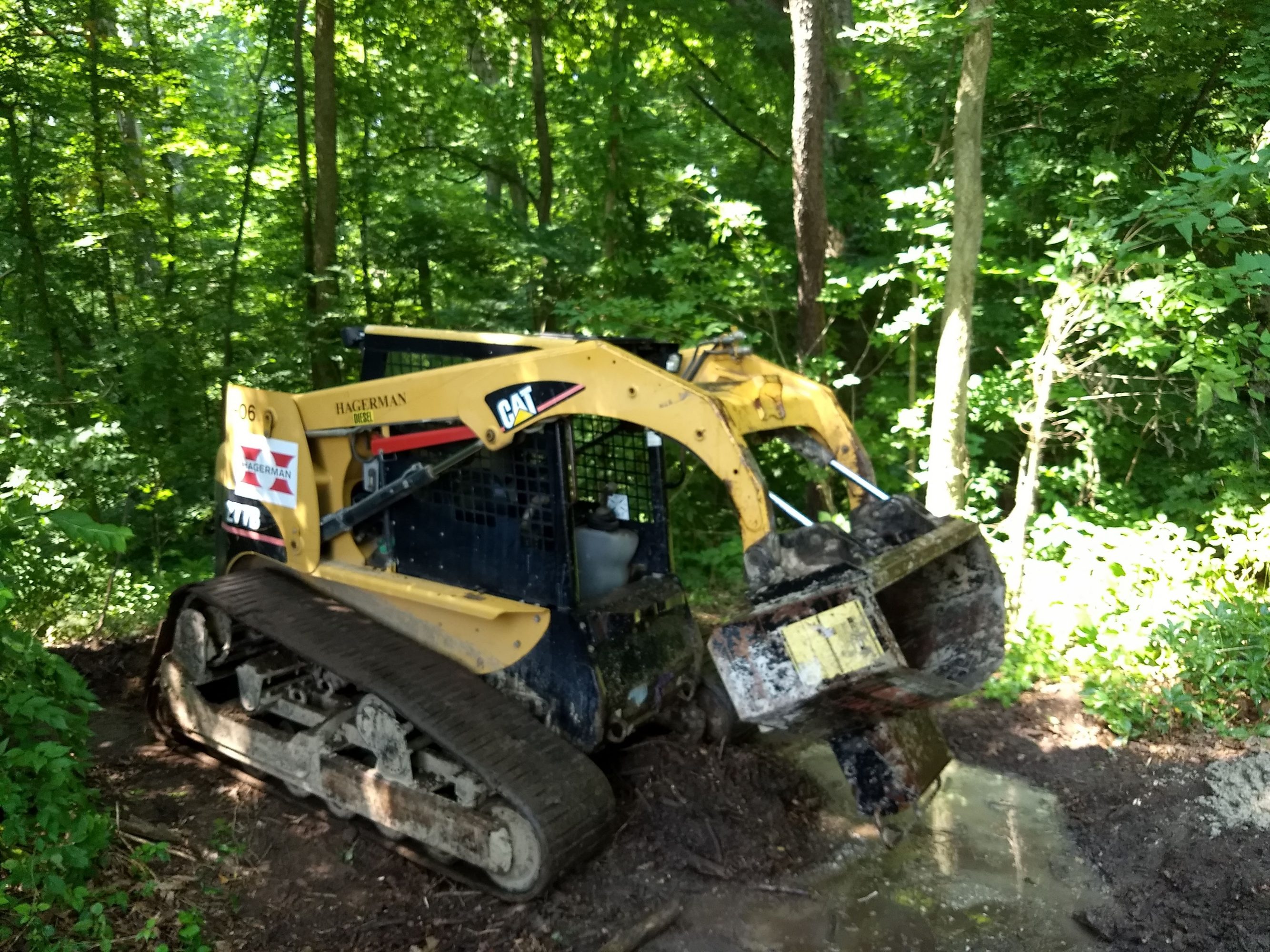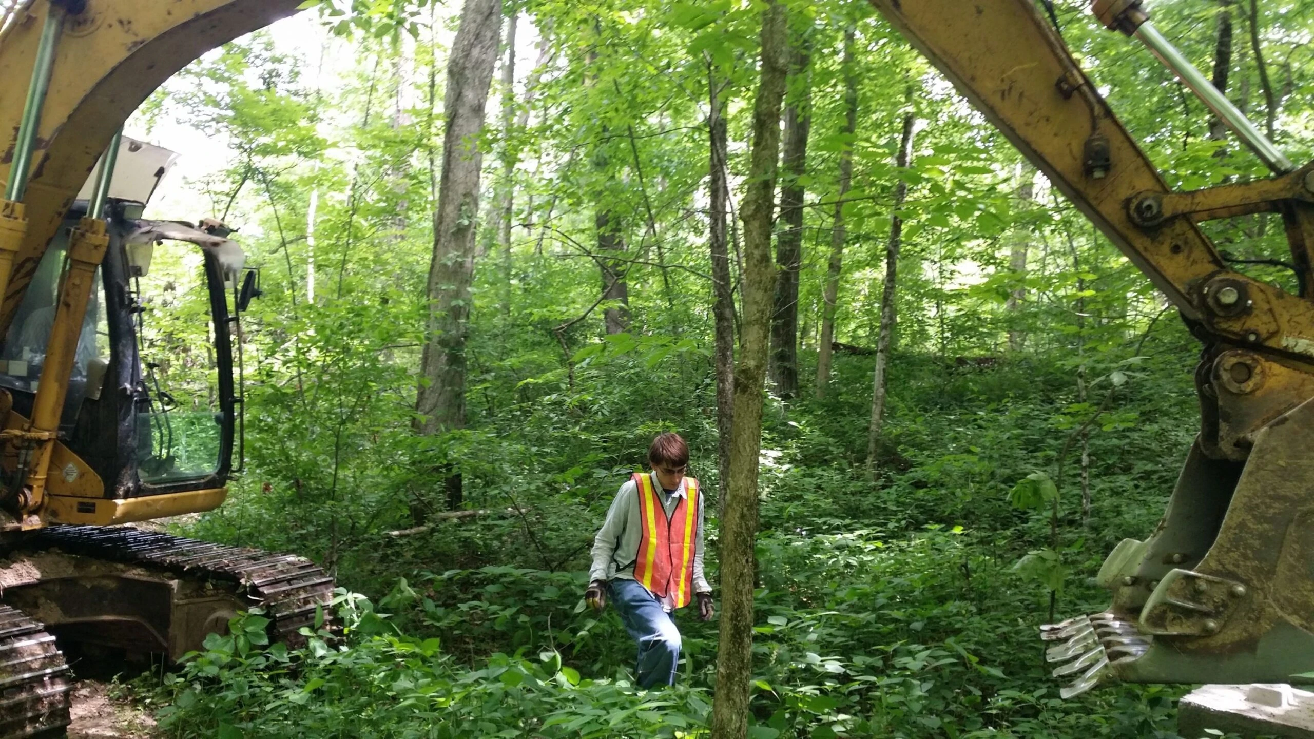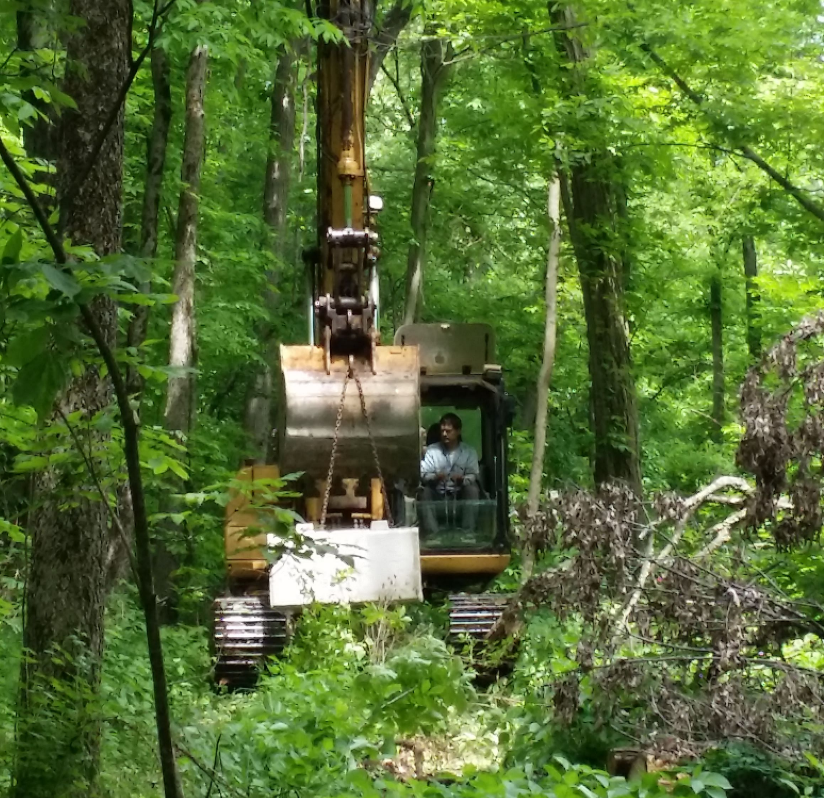 More partners jumped in: Southeastern Equipment Rental Co. provided an excavator small enough to maneuver between trees in order to dig the holes for the concrete blocks. Seiler Excavating, owned by Graham’s uncle, lent an excavator for removing the old bridge, and hauling in the steel frame and blocks. Three Rivers Barricade offered safety signage for the blind curve on Shoaff Road.