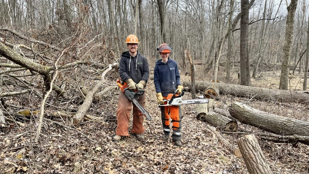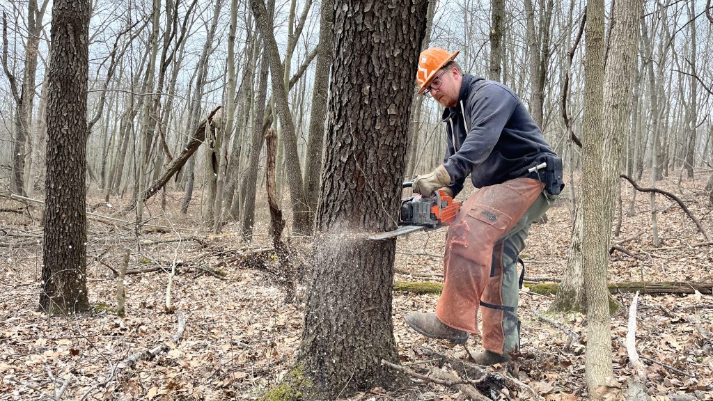 At this time, in portions of Ropchan Memorial, thinning is taking place as one of the early steps towards restoring an open oak woodland. In years to come, invasive species management will continue, along with the reintroduction of prescribed fire. On working lands, selective thinning is used to ensure the success of specific kinds of trees, including oak, hickory and walnut, for sustainable timber production.