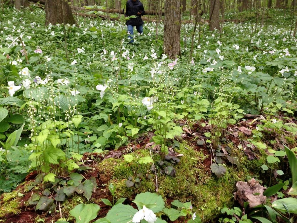 Following this and overlapping a bit is a third act in which we have the trilliums. The wake-robin or bloody butcher is the first of these to bloom. The big white grandiflorum will show up just as the second act draws to a close.