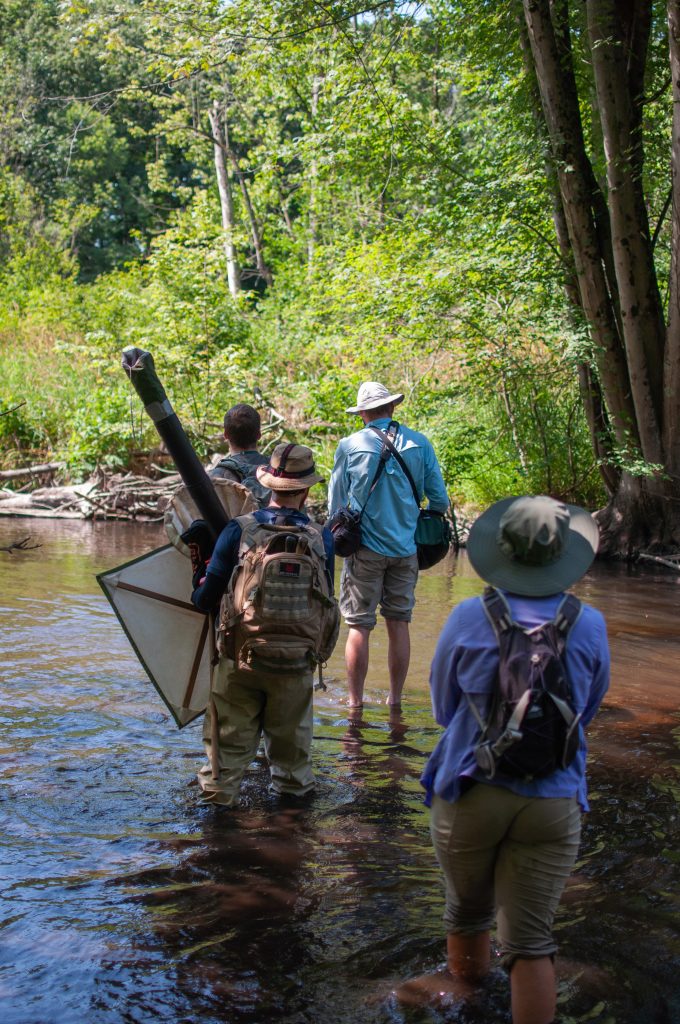 A midday sun flashing through the canopy catches the steady ripples of Fawn River. At first glance, it’s a calm sparkling picture. But if you pause to watch and listen, the corridor is full of life! A heron flies overhead as water beetles zip through the duckweed. Dancing damselflies line the shore, aquatic plants are pulled by the current, and a pack of people…are wading through the water?