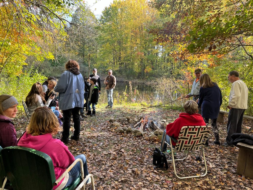 ACRES members gather around at campfire during Popp Open House for Members. This mature forest is open only once a year for ACRES members.