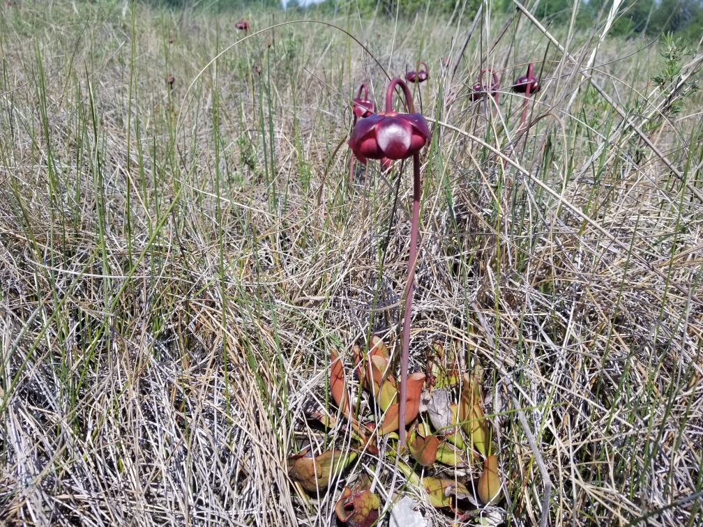 Pitcher plants bloom at Grass Lake. The carnivorous plants trap insects in rainwater-filled traps low to the ground. The flowers grow high above the foliage so pollinators don’t become prey