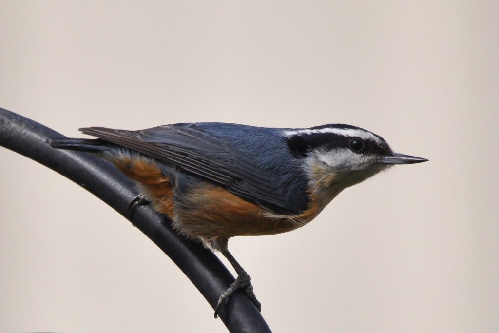Diminutive compared to our more common year-round White-breasted Nuthatch, the Red-breasted is also set apart by its rusty-red chest and distinctive eye stripe and the fact that it spends a bit more time on branches than the trunk-clinging White-breasted.