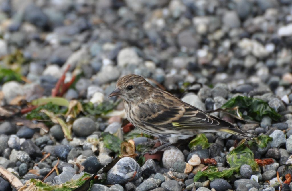 Pine Siskins are similar to Goldfinches but more slender, sporting light streaks and a yellow wash on wings and tail, with a wheezy distinctive “zzzzzziiiiiiiiiiiiip!” Pine Siskin like pine seeds, and in winter, thistle is tempting.
