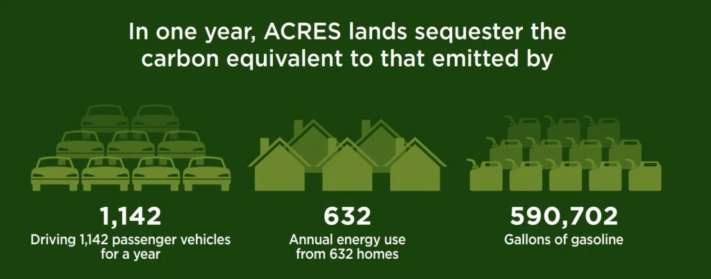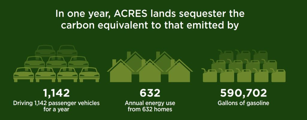 As ACRES creates partnerships and easements for working lands, the environmental and social sustainability of local communities can grow. Working land is protected from development and can be leased to local farmers below market value. These farmers are then required to follow best management practices to ensure healthier land, such as no-till farming and cover crops.
