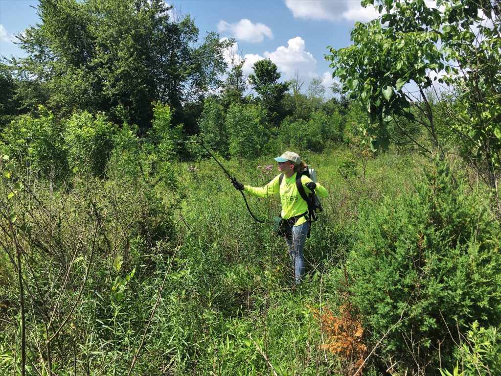 ACRES intern Jessica Gumberts sprays for non-native invasives.