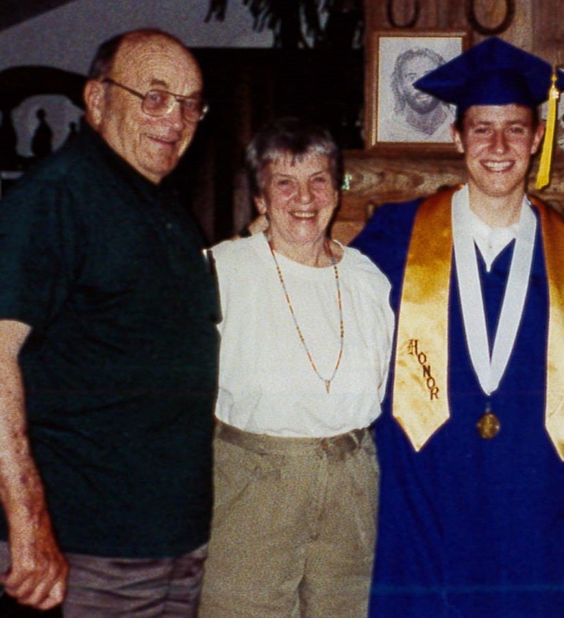 Tom and Jane Dustin, two of ACRES founders, pictured with Tim Diefenbach on the occasion of his high school graduation. As neighbors and ACRES volunteers for decades, Sue says the families shared not only the work and joys of land preservation, but a life together.