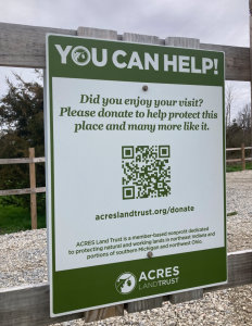 We also added an exit sign that visitors will see as they leave the preserve, a sign asking: “Did you enjoy your visit? Please donate to help protect this place and many more like it” along with a QR code to donate. Many people don’t realize that ACRES trails are made possible by our members. This new sign aims to change that. We’re excited to deliver these messages to visitors after they’ve just been inspired by a great visit!
