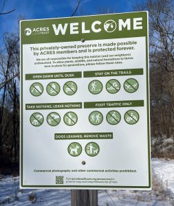 At open preserves, we’ve installed two new signs at our trailheads. The first sign features eye-catching and easy-to-understand graphic icons to illustrate preserve rules. As part of ACRES commitment to protect the land we own, we want to encourage visitors to help us keep these habitats undisturbed.