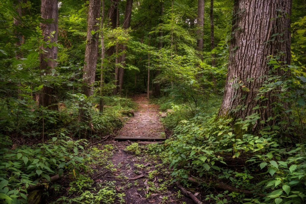 Located between a residential area and Airport Expressway, Fogwell Forest protects prairie and woodland habitats. The trail winds through tall grass before visitors enter the mature forest featuring giant oak and beech trees. In the shade beneath these giants are flowering dogwood and pawpaw and an impressive display of spring wildflowers.