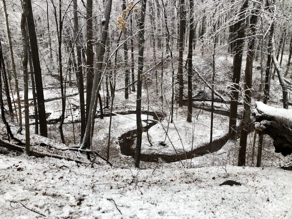 On the slopes beneath the trees grow bishop’s cap, jewelweed, rue anemone, wild phlox, blue cohosh, spring beauty, Virginia waterleaf and large-flowered trillium. In the trees are scarlet tanagers, indigo buntings, wood thrushes and rose-breasted grosbeaks.