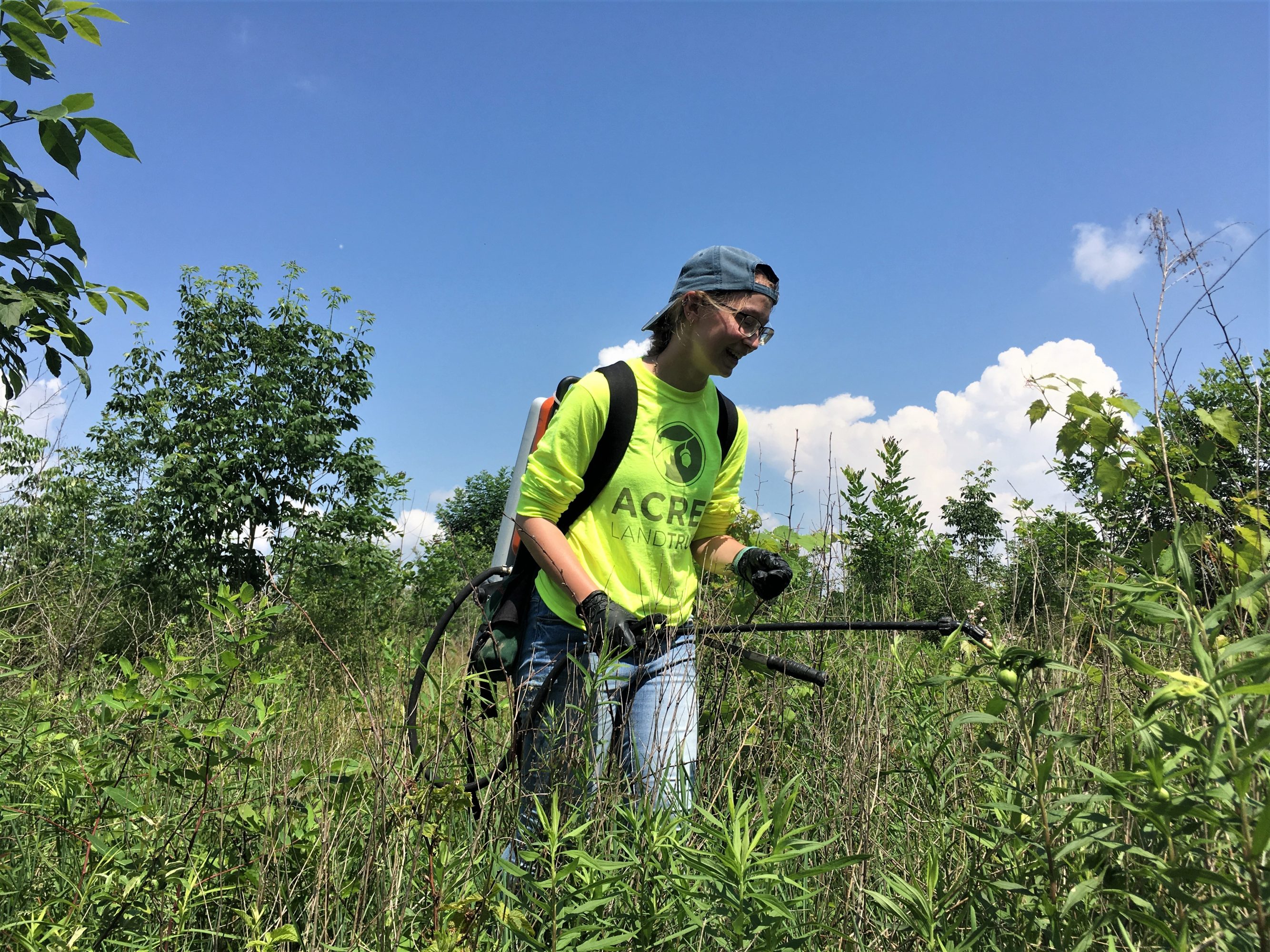 At Beechwood, on the Wabash County land, in the Cedar Creek Corridor and beyond, ACRES summer land management interns, funded by the Olive B. Cole foundation, sprayed smaller non-native invasive plants.
