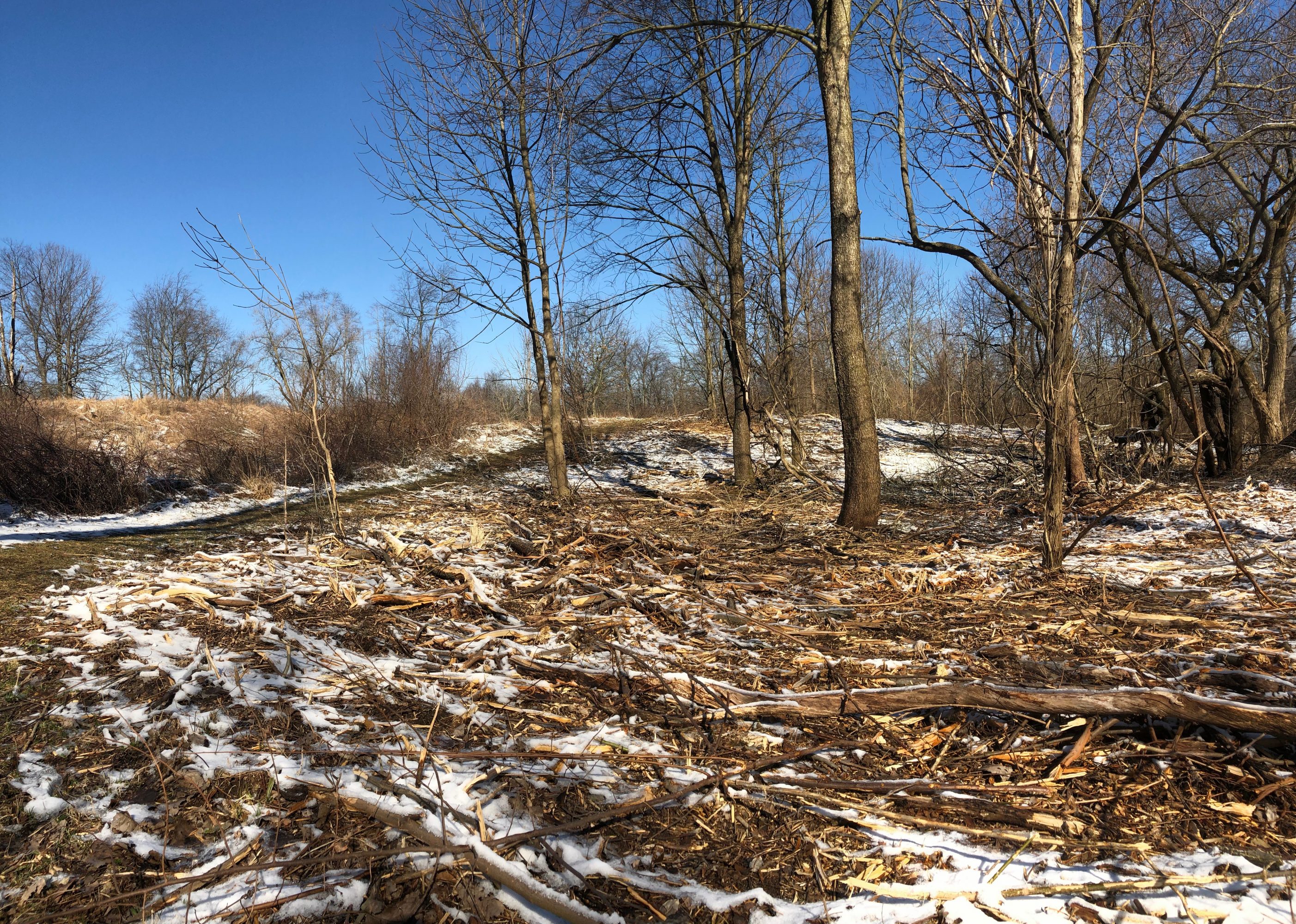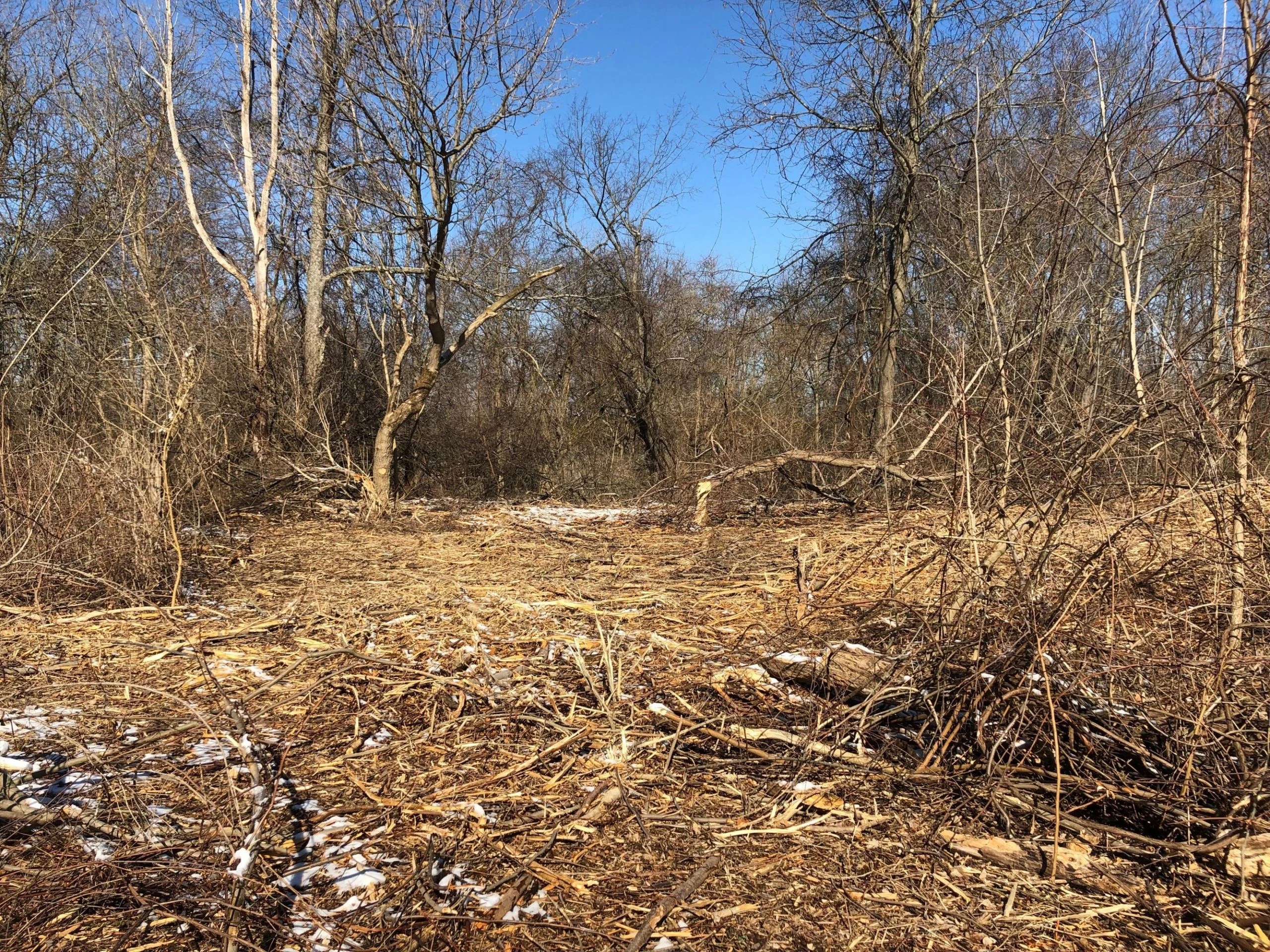 In Wabash County, on our 96-acre protected land near our Kokiwanee preserve, ACRES mulched a dense 5-acre patch of autumn olive, flagging trees to keep them safe from the path of destruction. Beneath the thicket of the invasive shrub, the land was almost entirely bare. The autumn olive had out-competed other plant life and taken over the area.