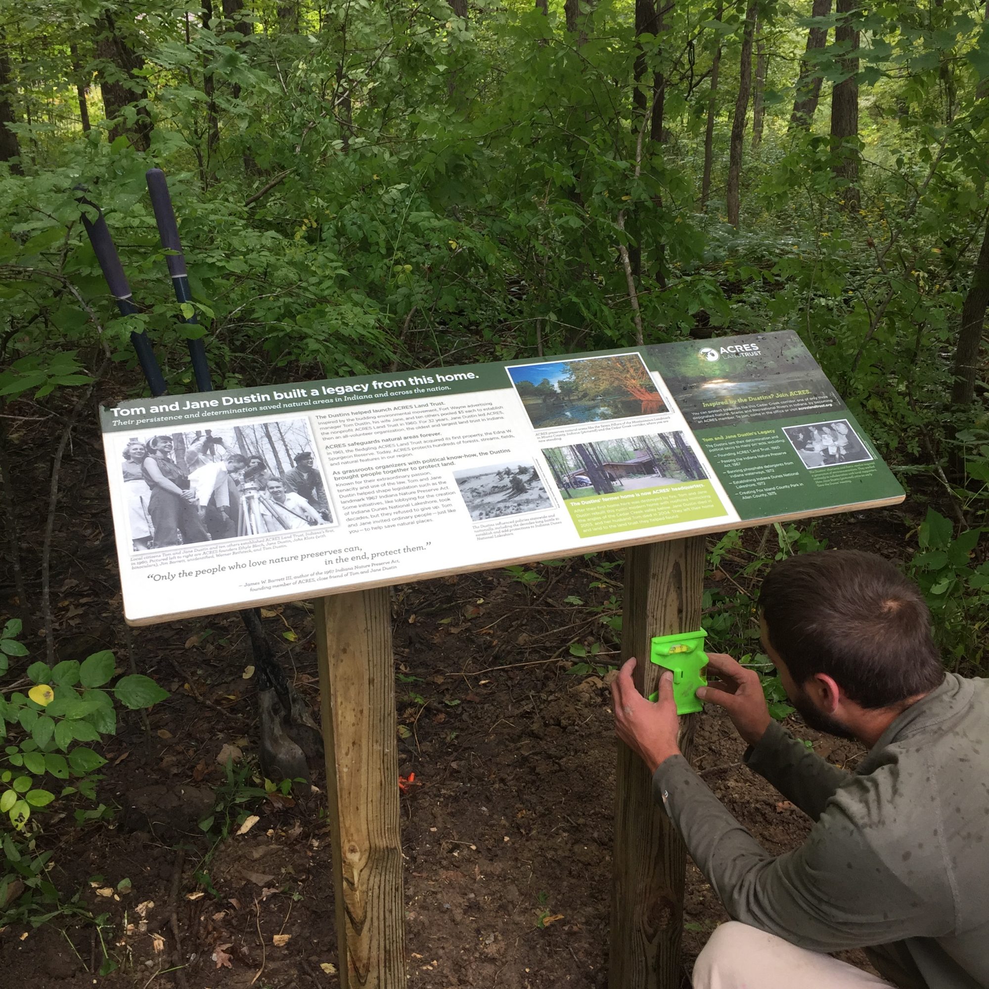 The interpretive panel being installed, just off the main parking area at the Tom and Jane Dustin Nature Preserve.