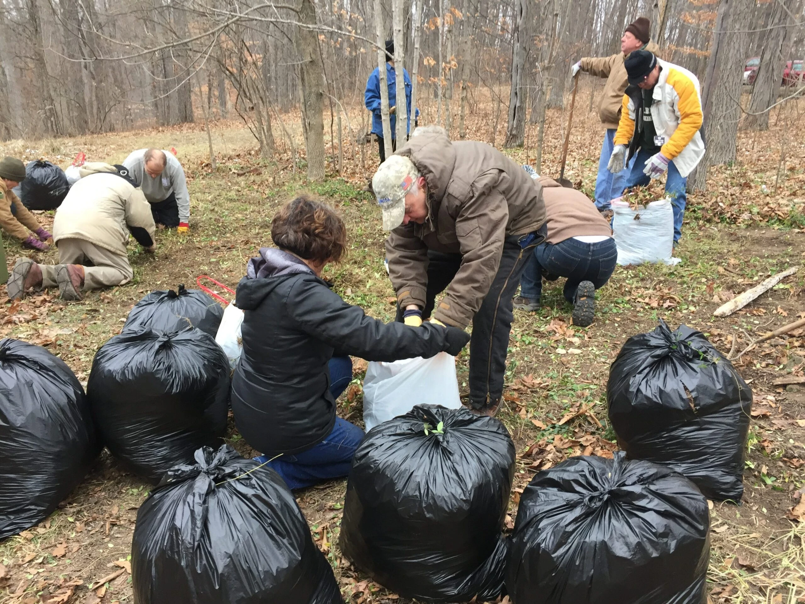 Together, we removed garbage bag after garbage bag of Vinca, bagging it to prevent it from re-rooting. Would you believe we had a good time? We were uncomfortable, kneeling on the cold ground, frozen fingers grasping the stringy plant, but we were in it together, laughing, sharing stories from the land. We made new friends and talked about ACRES preserves, other protected natural areas, wildlife we’ve seen from the trails, the range of non-native invasive plants in our region and about children and how they see the world. There we were, kneeling together, putting our desire for a healthy natural world into action, no matter the weather. It felt great.